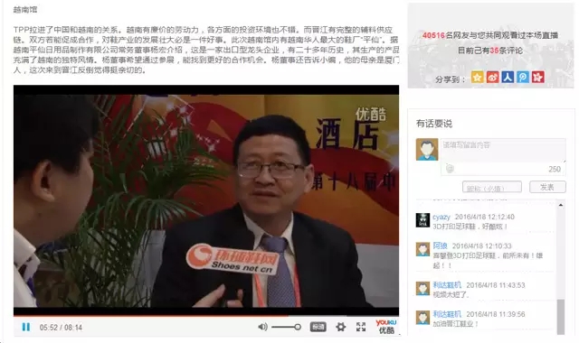 而在今年的418晉江鞋博會上,環球鞋網也通過“參與式”的直播,將鞋博會成果、亮點、新產品等向全球幾十萬訪客直播,用戶除了可以通過電腦手機來瀏覽,還可以進行互動交流